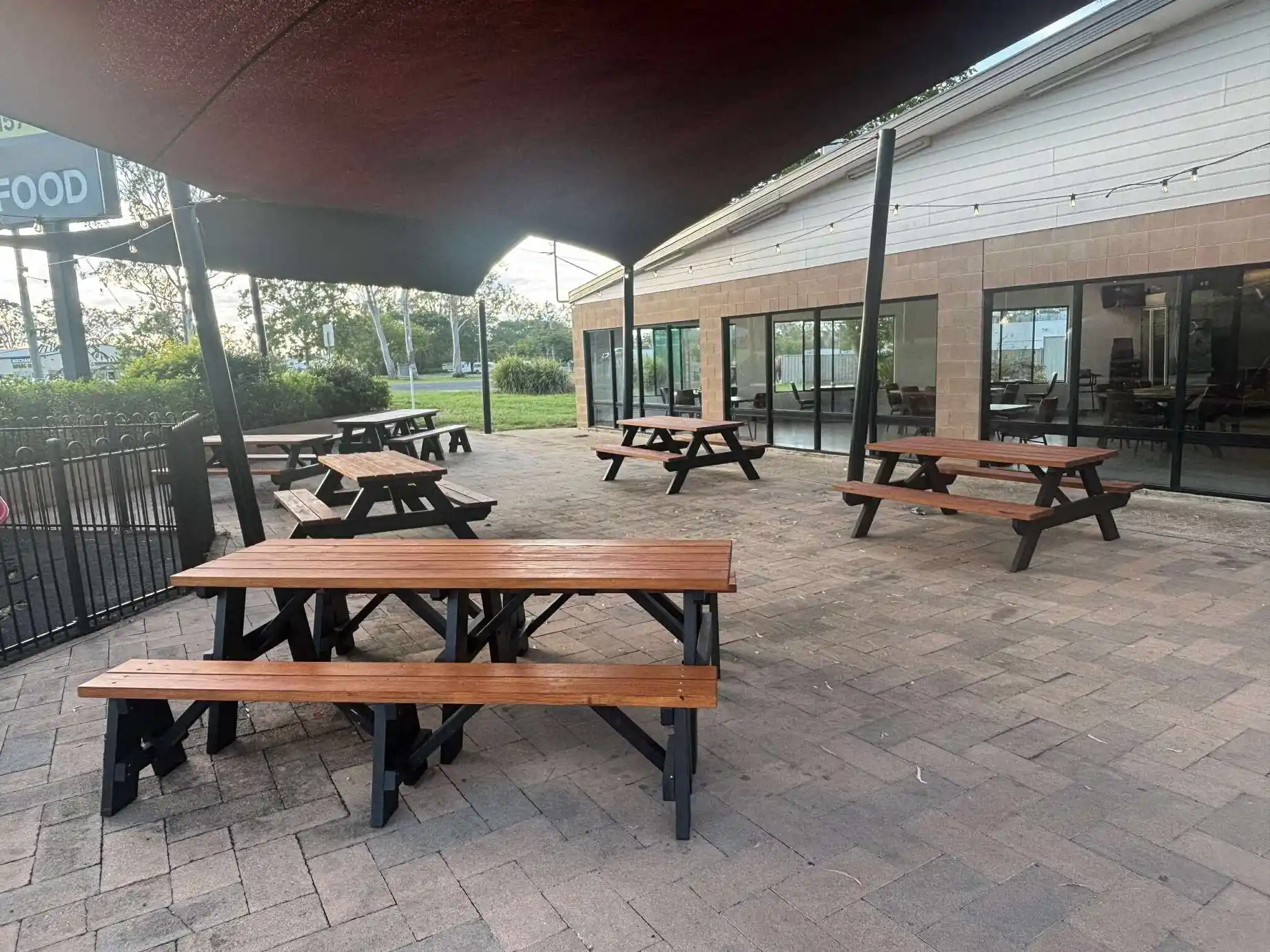 There are plenty of outdoor seating options. Venues tend to come back to timber picnic tables because they solve a problem that most other furniture does not: how do you seat two people, or eight, at the same table without the space feeling either too empty or too crowded?