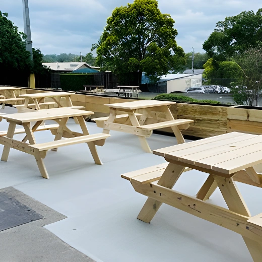 Light-coloured JJ Timber Design picnic table positioned on an asphalt driveway.